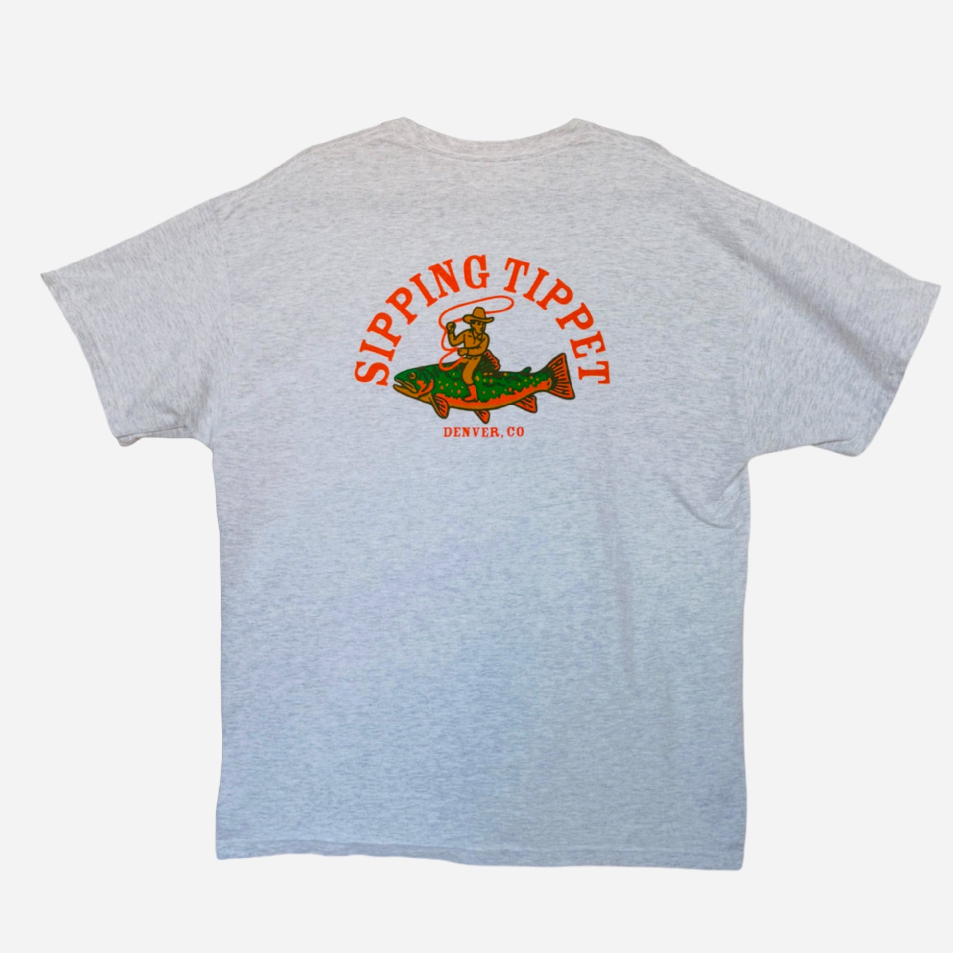 Back: Full-size Trout Cowboy artwork with bold “Sipping Tippet - Denver, CO” lettering.